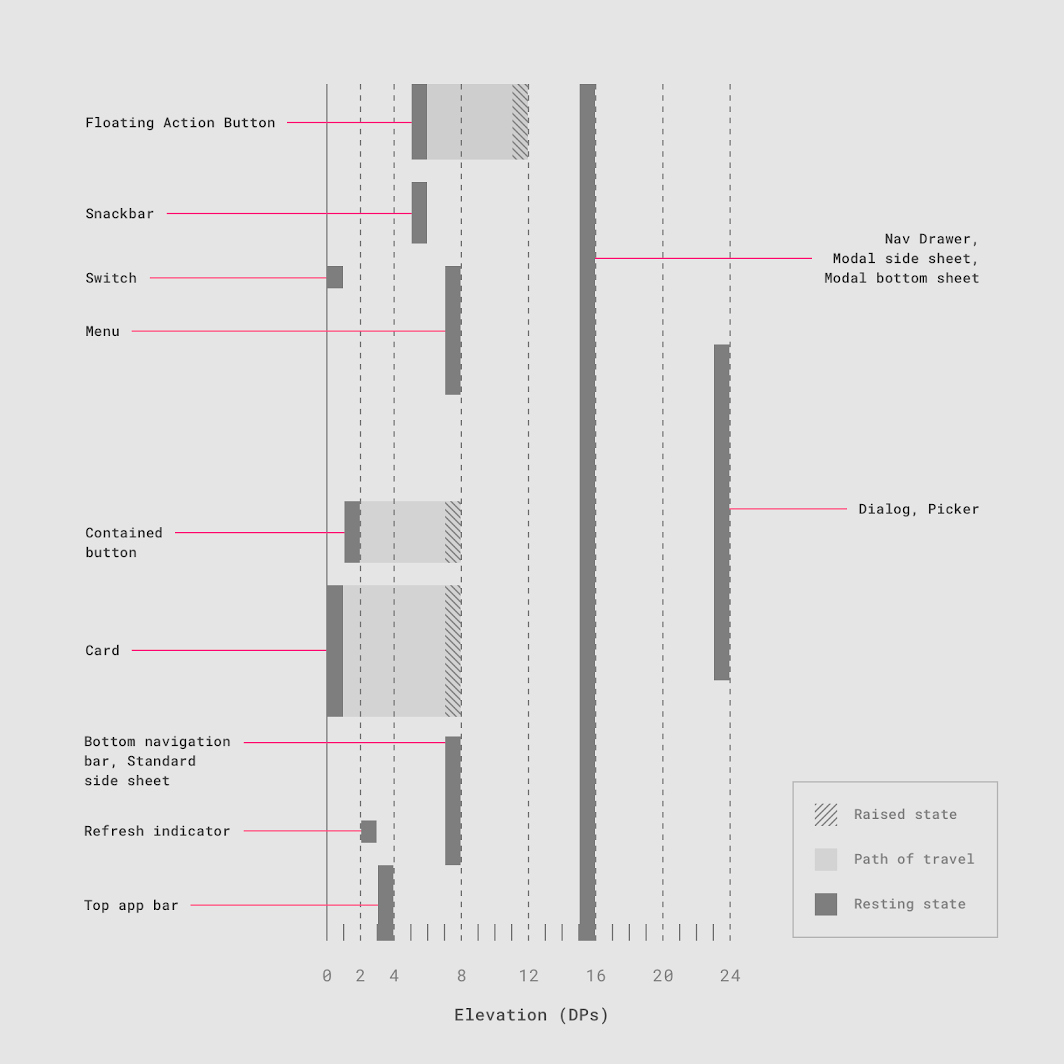 The design system provides a set of pre-defined SCSS placeholder selectors which allow consistent application of realistic-looking shadows which map to a range of elevations from 1dp to 24dp.